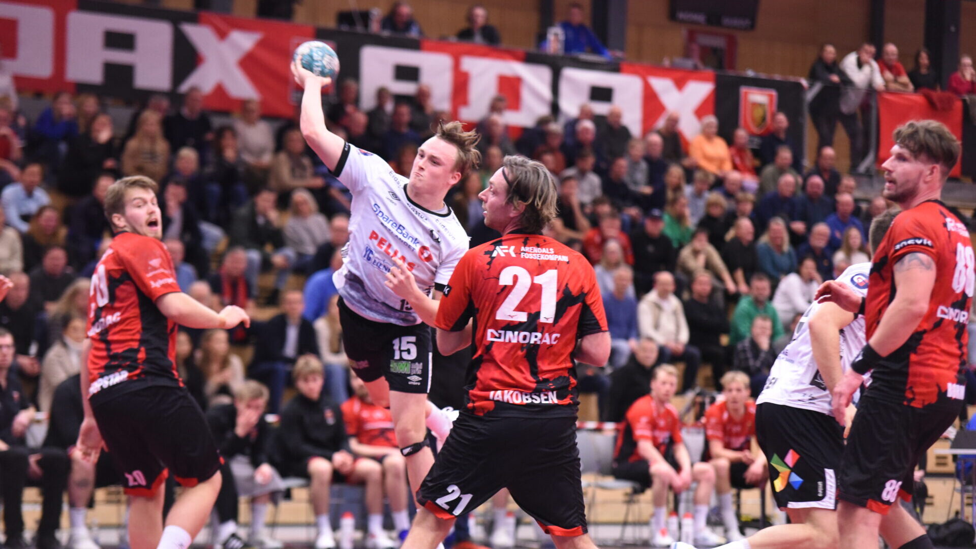 Sindre Heldal var også mannen som sørget for at Elverum ledet 20-19 da han lekte inn en ball bak en spretten Kristijan Jurisic i Arendal mål. Lagene fulgte hverandre som skygger og byttet på å score mål den neste perioden. Hjemmelaget fikk muligheten til å økte til to mål da Elverum gjorde en teknisk feil i sitt angrepsspill. Fiala sørget for 24-22 for hjemmelaget med 12 minutter igjen av kampen. Arendal økte til tre mål, og da var det Elverum som måtte gjøre justeringer med en timeout da de hadde kniven på strupen de siste 11 minuttene av kampen. Elverum svarte godt opp med to scoringer på rad. Med 8:30 igjen var det hjemmelaget som ledet 25-24 i toppoppgjøret på Sørlandet. Elverum hadde to muligheter til å utligne, men det var Arendal som satte de to neste målene i kampen, og dermed var Elverum tre mål bak med fem minutter igjen. Og i tillegg hadde de Awad utvist i to minutter.