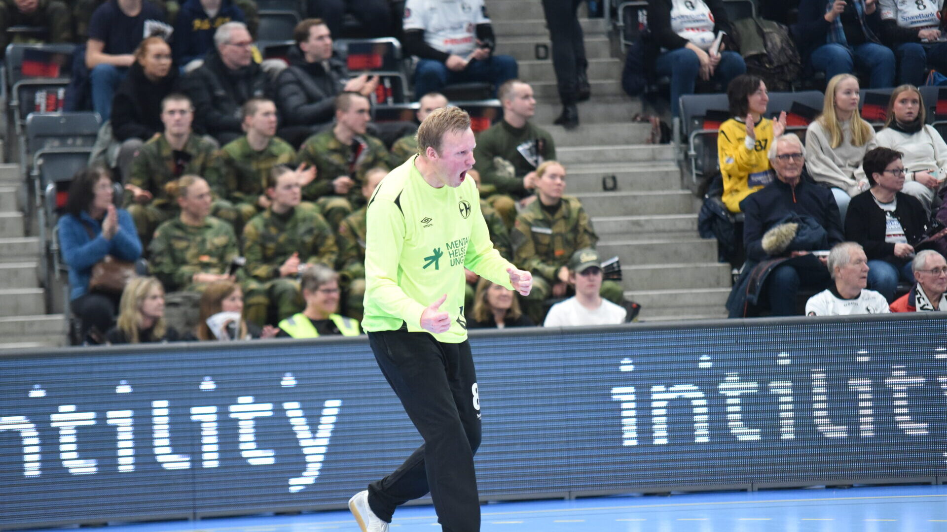 Det skulle ta over 12 minutter før Sandnes klarte å overliste målvakts legenden Morten Nergaard. Det måtte er straffekast til. Etter 20 minutter ledet Elverum 14-8. Etter dette fikk Sandnes noen raske mål, men Simen Søgård sørget for at Elverum ledet 15-10 etter 22:30 spilt. Elverum hadde grei kontroll på Sandnes, men det var fortsatt spenning i kampen som skulle sette søkelyset på den mentale helsen.